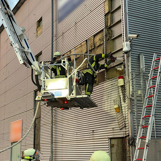 Parallel ging ein Trupp der Kameraden aus Sprendlingen, mit Atemschutz ausgerüstet, im Gebäude vor und öffnete von innen die Fassade.